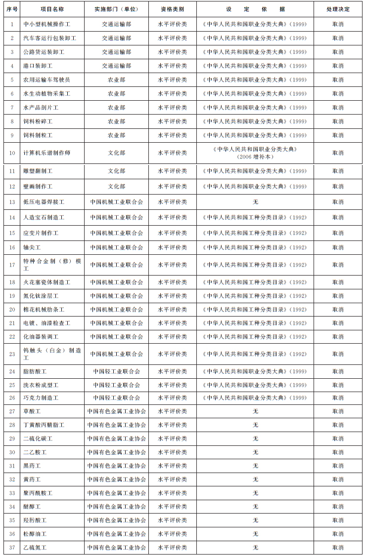 国务院决定取消的职业资格许可和认定事项目录(共计62项)