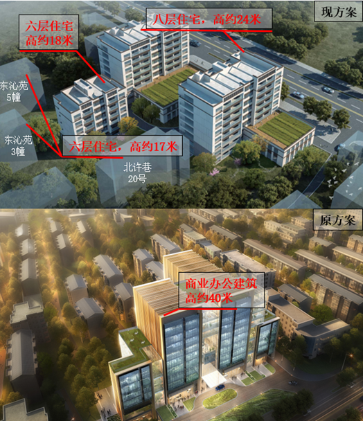 本项目位于北许巷41号。本次住宅项目拟建3幢住宅、配套商业服务网点、物业用房及地下车库等,其中西侧1幢6层住宅高约18米,东侧2幢8层住宅高约24米。原商业办公项目高约40米,苏州佳荣置业有限公司考虑到周边居民对商务办公楼建成后在日照采光、噪音等方面影响的意见,现计划实施本住宅项目。