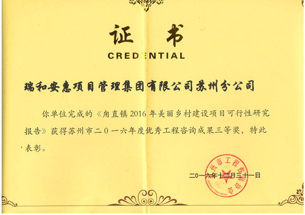公司完成的《盛禧奥石化(张家港)有限公司采用本体连接法年产7.5万吨ABS扩建项目社会稳定风险评估报告》及《甪直镇2016年美丽乡村建设项目可行性研究报告》分别荣获苏州市二零一六年度优秀工程咨询成果二等奖、三等奖。