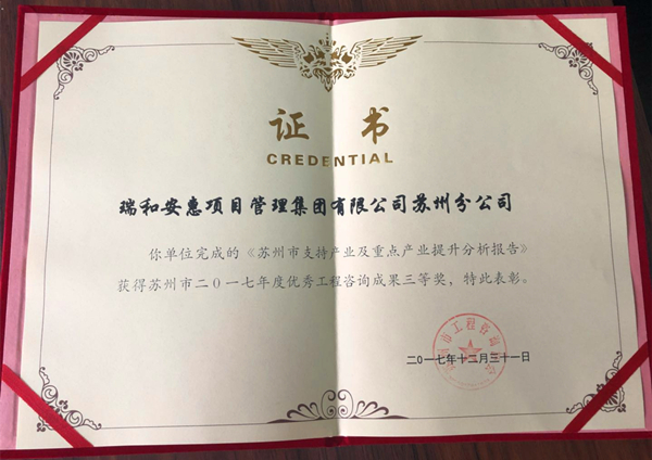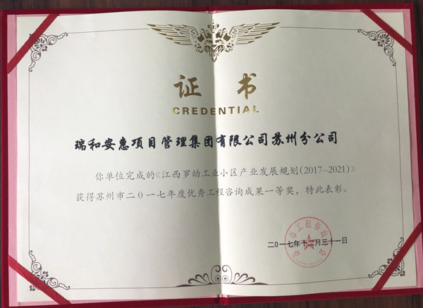 公司完成的《江西罗坳工业小区产业发展规划(2017-2021)》及《苏州市支柱产业及重点产业提升分析报告》分别荣获苏州市工程咨询协会2017年优秀工程咨询成果奖一等奖及三等奖。